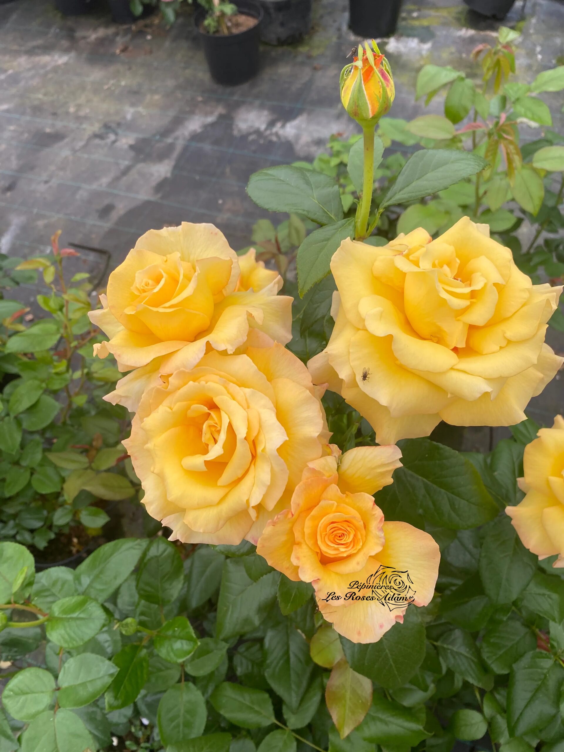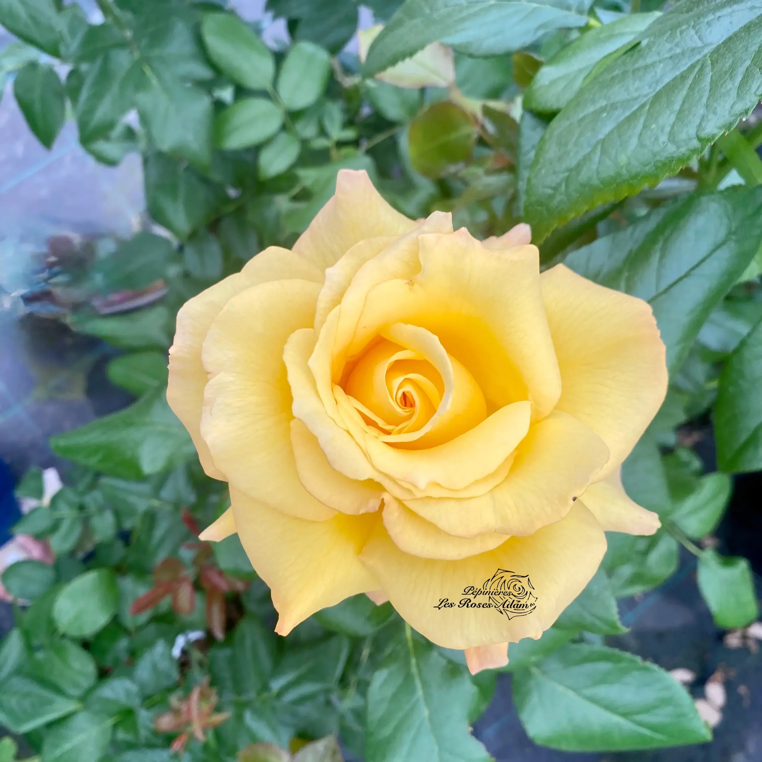 Rosier buisson à grande fleur d’un jaune vif (couleur préféré de Laurence boccolini) ourlé d’orange au parfum florales vert boisé et patchouli. Son feuillage vert moyen lustré contraste avec le jaune de sa rose.