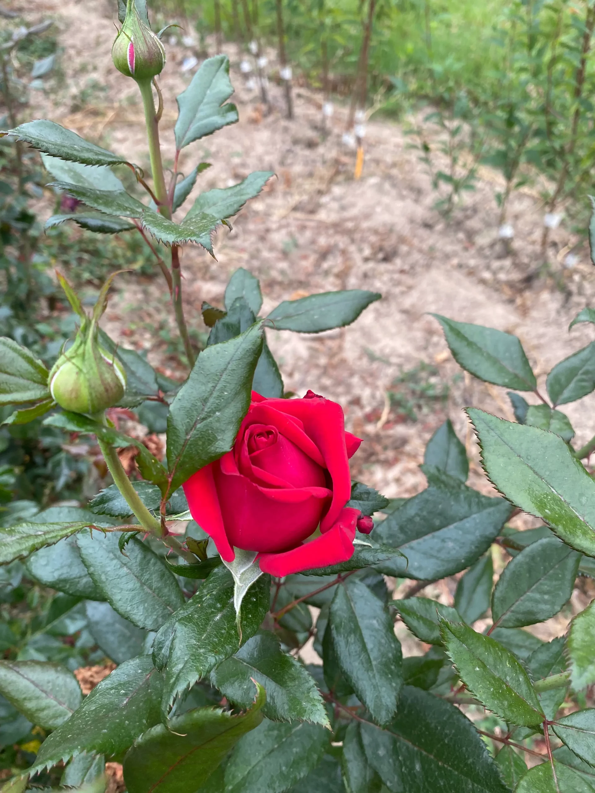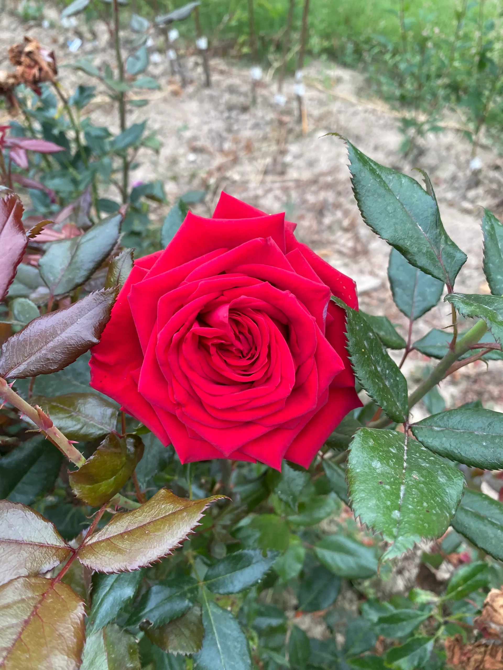 Rosier buisson à grandes fleures d’un rouge groseille aux nombreux pétales (50 pétales) bien serrés s’ouvrant délicatement pour nous révéler son joli coeur vert